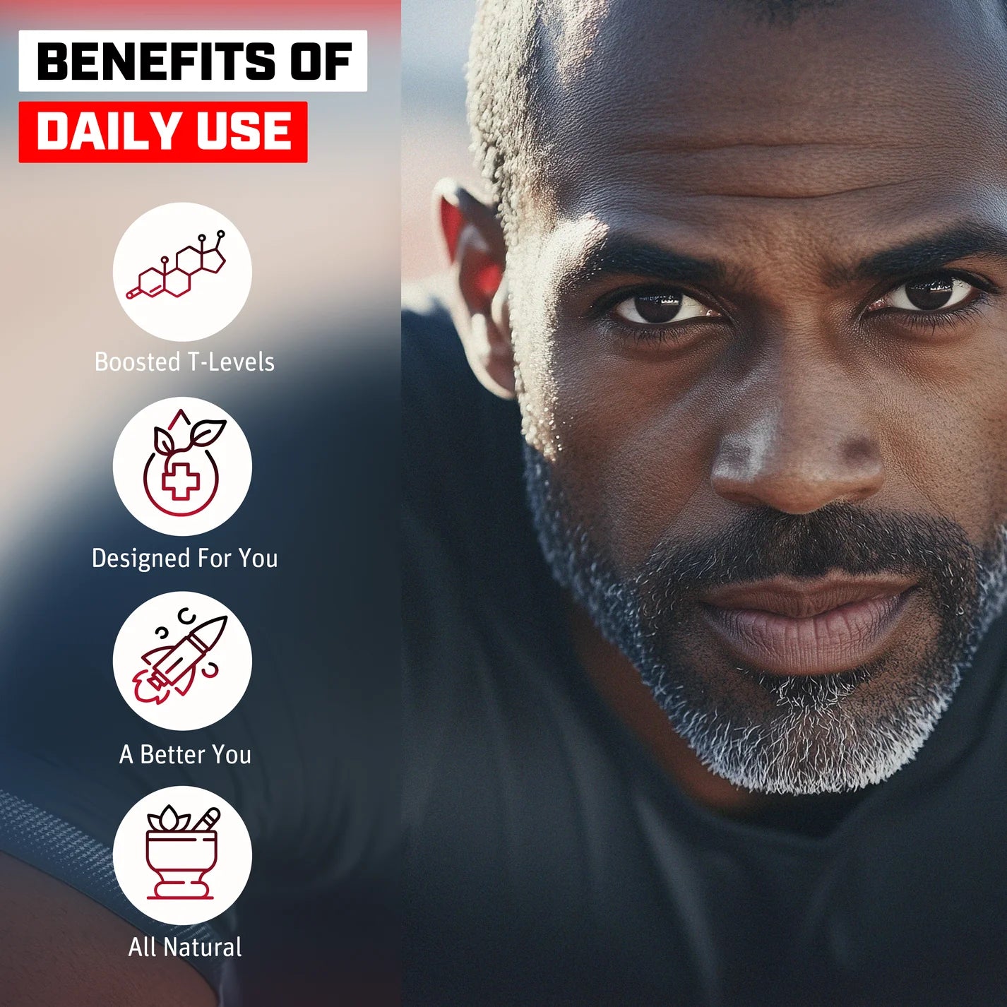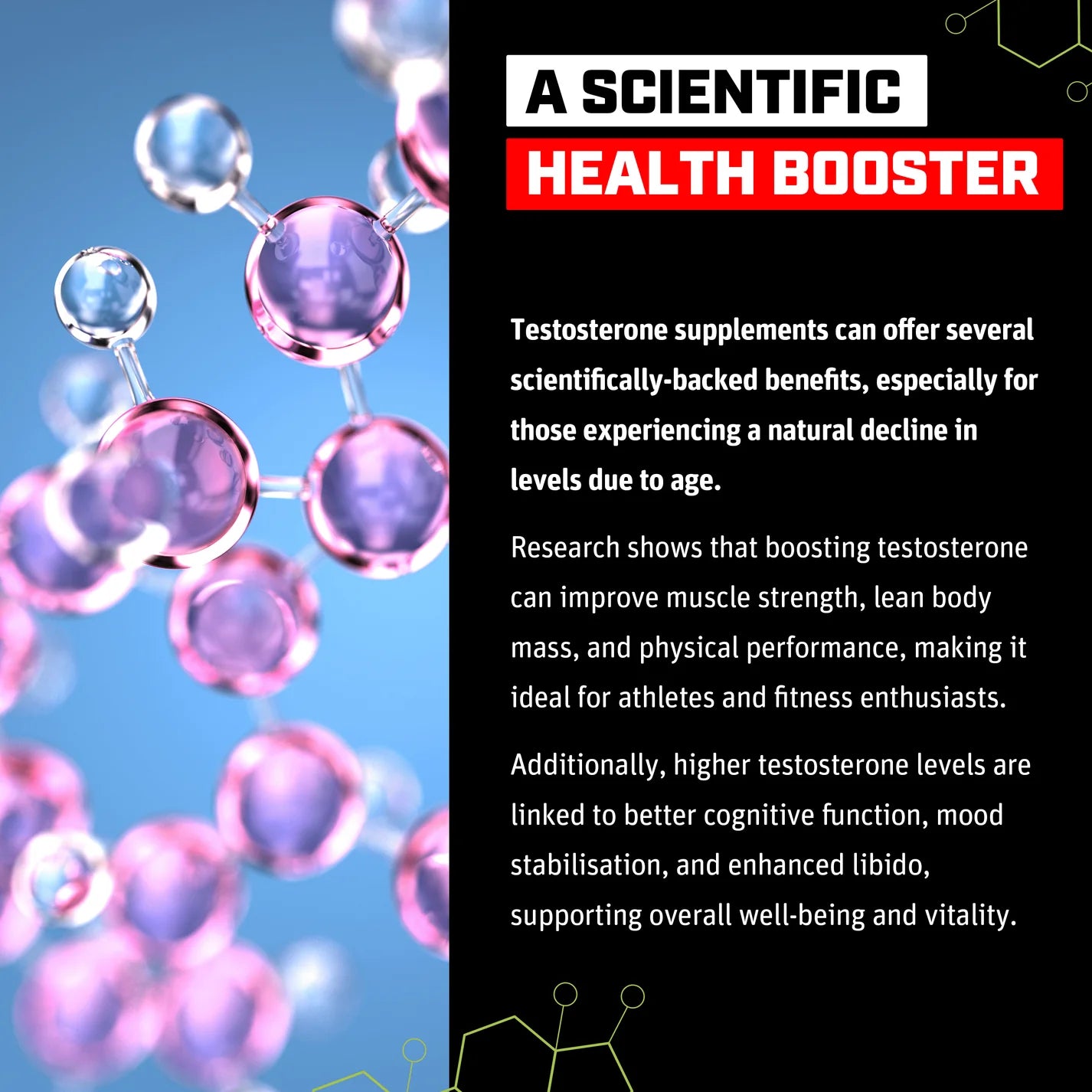 Stronger body. Sharper mind. Better mood. Boosting testosterone is proven to enhance strength, focus confidence and improve your performance in the gym and your bedroom.